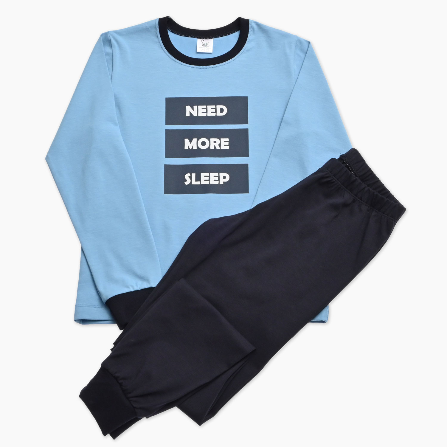 Otroška pižama – svetlo moder in temno moder komplet z napisom NEED MORE SLEEP