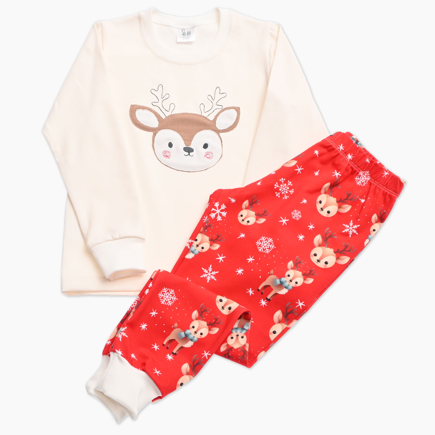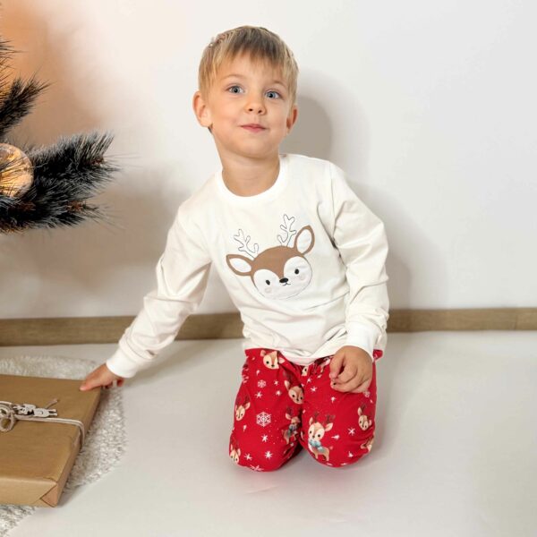 Otroška pižama z vezenim jelenčkom na bež majici in tiskanimi jelenki na rdečih hlačah