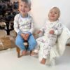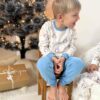 Zgornji del pižame je v nežni bež barvi in okrašen s sladkim tiskom pingvinčkov, spodnji del pa modri barvi, ki skupaj ustvarjate čudovit praznični komplet. Za udobje in popolno prileganje so na vratu, rokavih in hlačnicah dodani patenti, v pasu pa mehka elastika, ki se prijetno prilagaja gibanju malčka.