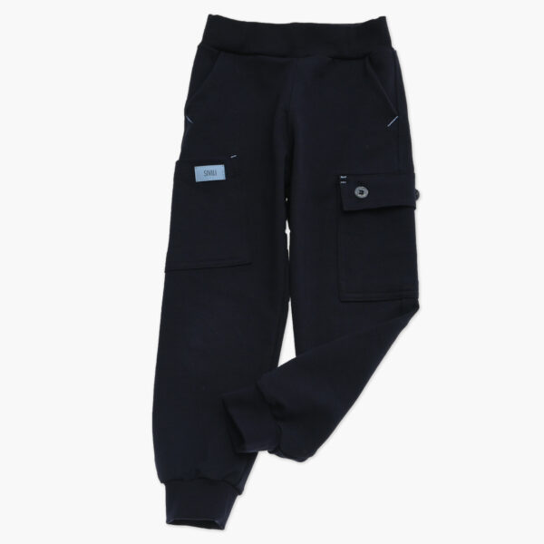 Hlače imajo dva notranja in dva stranska žepa, ki nudijo prostor za male zaklade in igrače, medtem ko mehka elastika v pasu omogoča prilagojeno prileganje brez tiščanja. Hlačnice so zaključene z elastično tkanino, ki prepreči, da bi hlače lezle previsoko, hkrati pa ohranja svobodo gibanja.