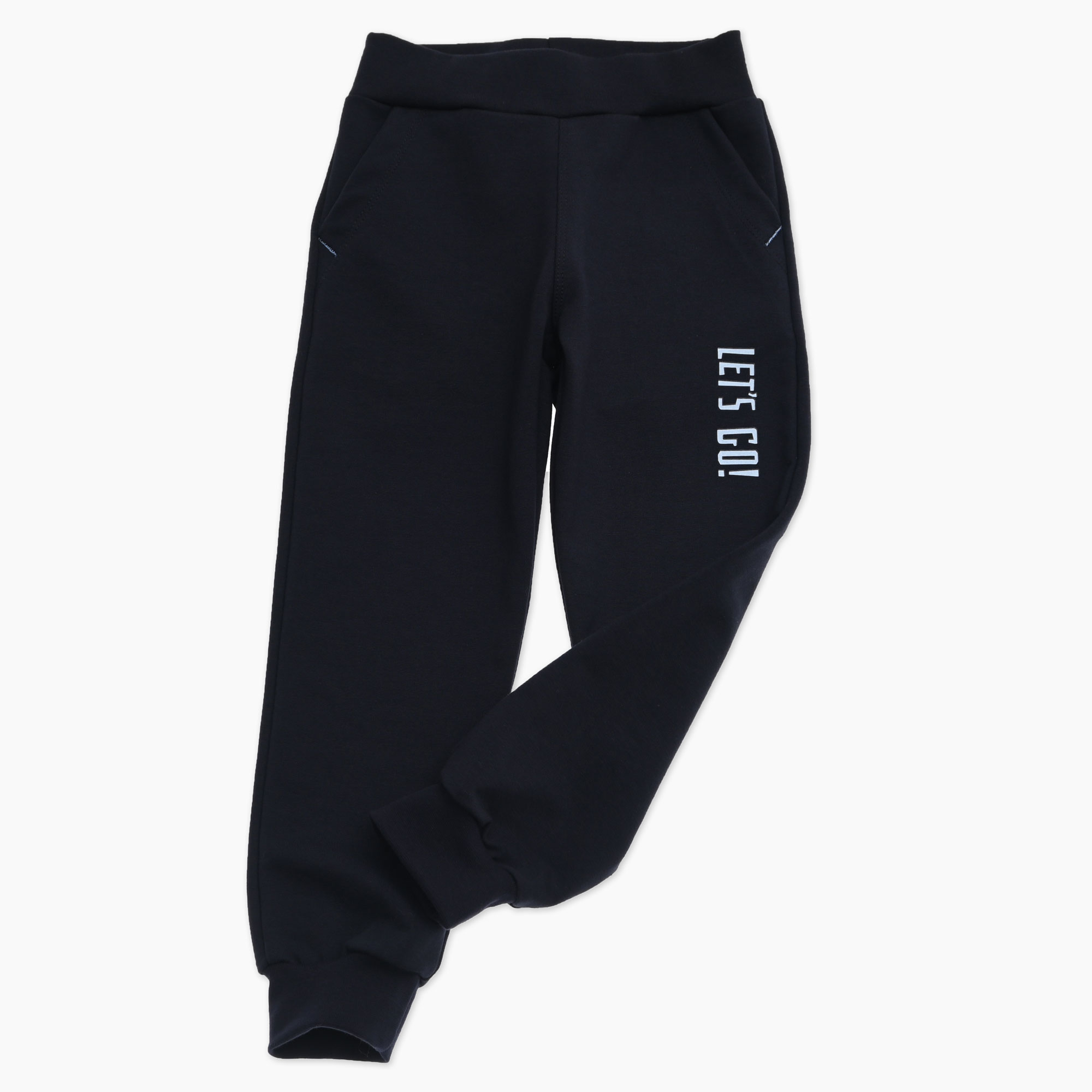 Otroške hlače iz organskega bombaža za fanta v temno modri barvi z notranjimi žepi in napisom LET’S GO!