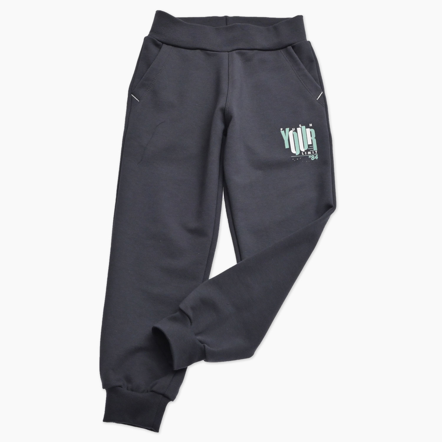 Otroške hlače iz kosmatenega bombaža za fanta v temno sivi barvi z napisom PUSH YOUR LIMIT in notranjimi žepi