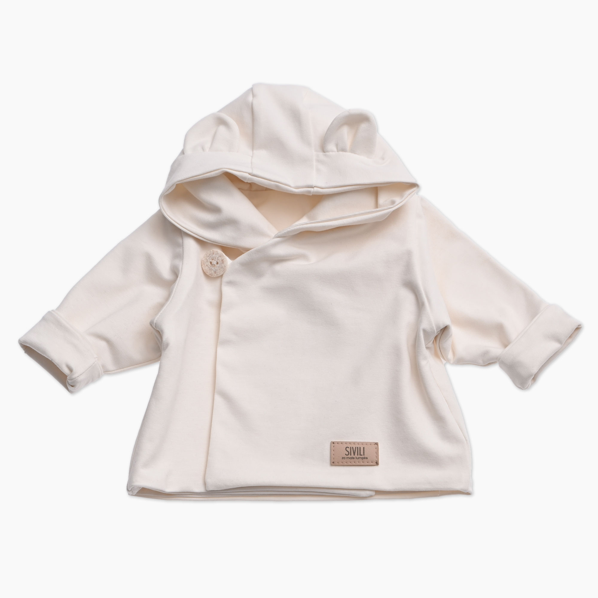 Vsaka jopica je ročno izdelana v majhni seriji z izbiro materialov in detajlov, ki so prijazni otroku: mehka podloga, leseni gumbi z zapenjanjem na prekrivanje, kapuca z ušeski medvedka, našitek “Sivili – za male lumpke”. Material je mešanica naravnega bombaža in elastana, ki omogoča prijetno raztezanje in enostavno oblačenje, hkrati pa ostaja nežen do kože.